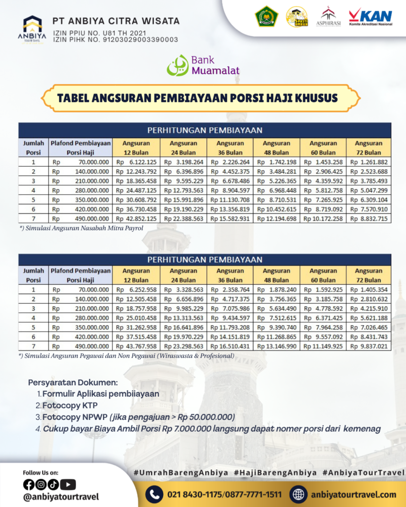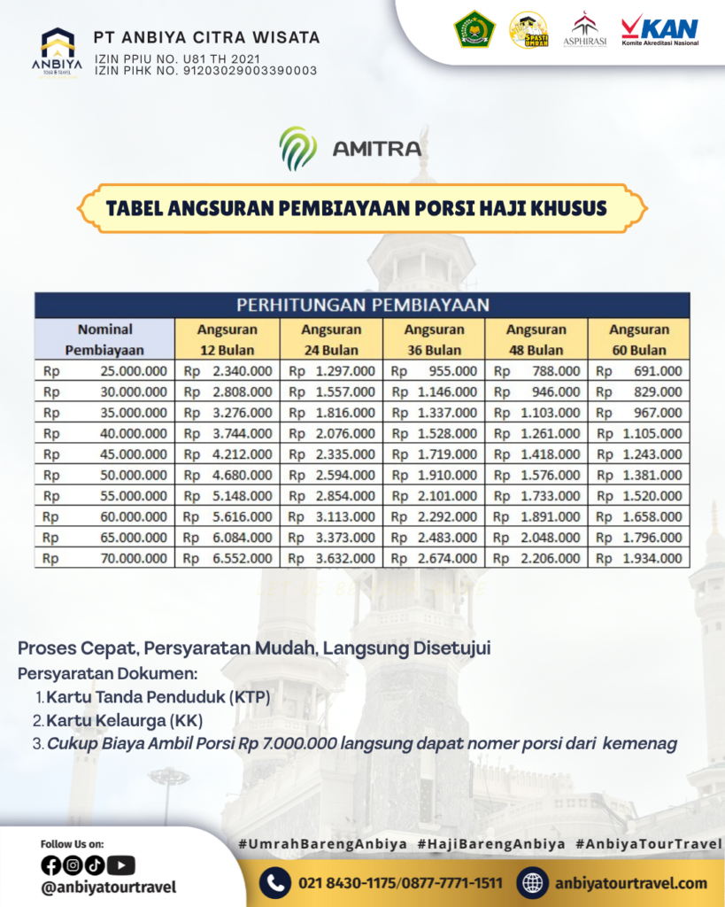 Sudah waktunya wujudkan impian berhaji dengan Program Cicilan Haji Plus dari Anbiya TourTravel. Program Cicilan Haji Plus dirancang untuk mempermudah Calon Jamaah yang ingin menunaikan Ibadah Haji namun terkendala oleh biaya. Anbiya TourTravel hadir untuk menjadi jembatan bagi niat suci Anda. Kami percaya bahwa keterbatasan biaya bukanlah penghalang untuk memenuhi panggilan Allah ke Baitullah. Melalui program ini, niat Anda bisa segera diamankan tanpa harus menunggu tabungan terkumpul sepenuhnya terlebih dahulu.